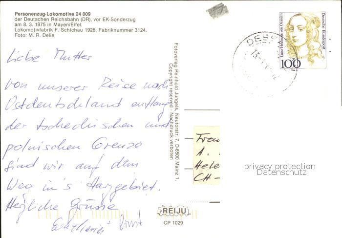 alte Postkarte Lokomotive Personenzug-Lokomotive 24 009 Deutsche Reichsbahn Mayen Eifel postalisch gelaufen Erhaltung siehe scans