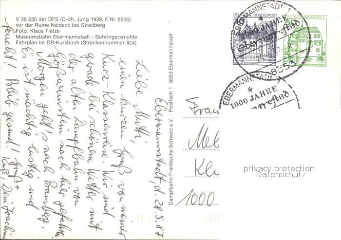 alte Postkarte Lokomotive V 36 235 DFS Ruine Neideck Streitberg postalisch gelaufen Erhaltung siehe scans