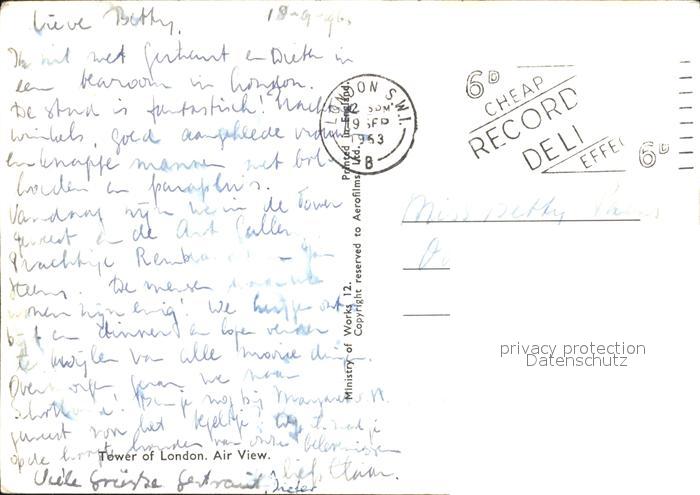 old postcard London Fliegeraufnahme Tower postalisch gelaufen Erhaltung siehe scans