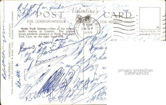 old postcard London Hyde Park Corner postalisch gelaufen Erhaltung siehe scans
