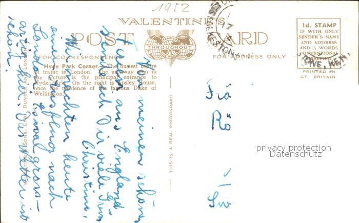 11777443 old postcard London Hyde Park Corner Doppeldeckerbus Valentine’s Post Card postalisch gelaufen Erhaltung siehe scans KatCode: 11570UKI1I11AA