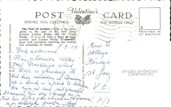 old postcard London Pool of London between London Bridge and Tower Bridge Vessels Valentines Postcard postalisch gelaufen Erhaltung siehe scans