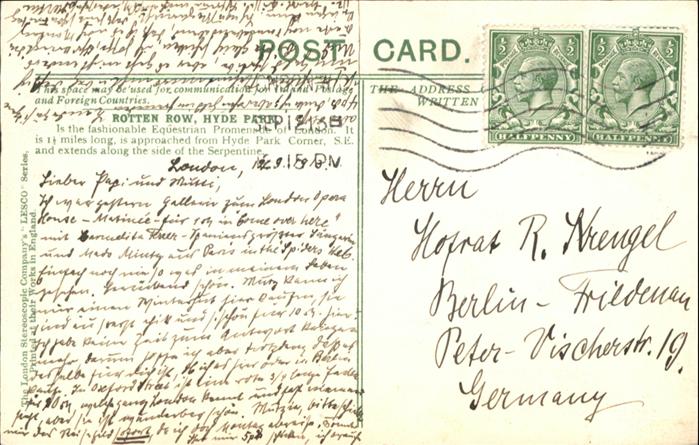 10990585 old postcard London Rotten Row Kutsche postalisch gelaufen KatCode: 11570UKI1I11AA