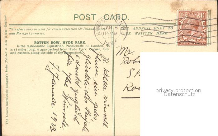 11777590 old postcard London Rotton Row Hyde Park Equestrian Promenade Pferdekutsche postalisch gelaufen Erhaltung siehe scans KatCode: 11570UKI1I11AA