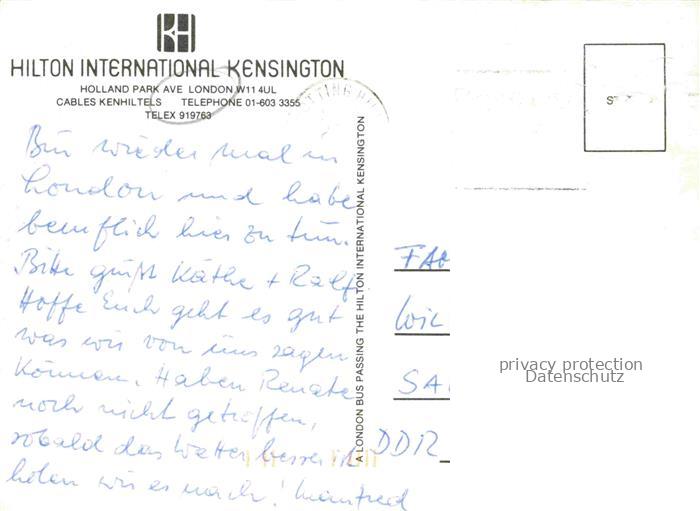 74100339 old postcard LONDON UK Hilton International Kensington Hotel postalisch gelaufen Erhaltung siehe scans [FriedD77] KatCode: 11570UKI1I11AA