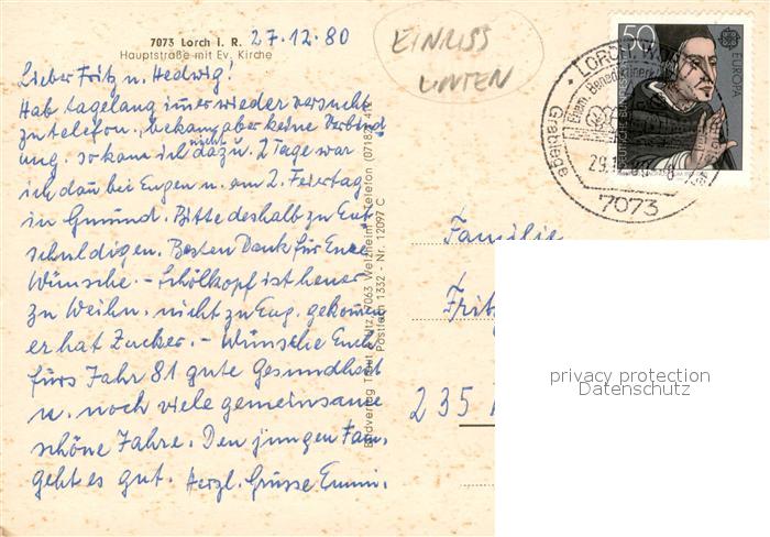 73652329 alte Postkarte Lorch Rheingau Hauptstrasse mit evangelischer Kirche Fachwerkhaus im Winter postalisch gelaufen Erhaltung siehe scans [FriedD77] KatCode: 11110006439010