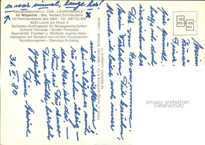 72482635 alte Postkarte Lorch Rheingau Speiserestaurant Cafe Laukenmuehle im Wispertal Gastraeume Terrasse postalisch gelaufen Erhaltung siehe scans KatCode: 11110006439010