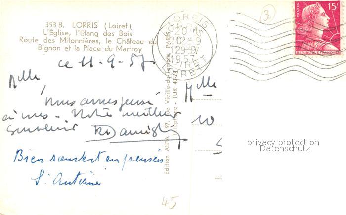 13504786 carte postale Lorris Eglise Etang des Bois Route des Mitonnieres Chateau du Bignon Place du Martroy postalisch gelaufen Erhaltung siehe scans [FriedD77] KatCode: 11170045145187