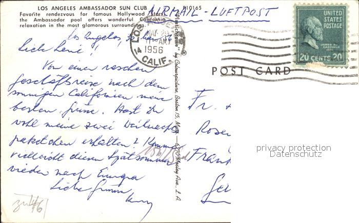 72506453 old postcard Los Angeles California Ambassador sun club pool postalisch gelaufen Erhaltung siehe scans KatCode: 14140050000000