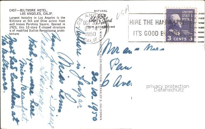 72460038 old postcard Los Angeles California Bildmore Hotel postalisch gelaufen Erhaltung siehe scans KatCode: 14140050000000