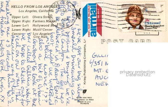 73295375 old postcard Los Angeles California Olvera Street Farmers Market Hollywood Bowl Music Center City Hall postalisch gelaufen Erhaltung siehe scans [KathaD81] KatCode: 14140050000000