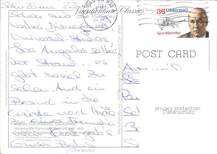 72577045 old postcard Los Angeles California showing the famous Hollywood sign Griffith Planetarium on the distant mountains postalisch gelaufen Erhaltung siehe scans [FriedD77] KatCode: 14140050000000