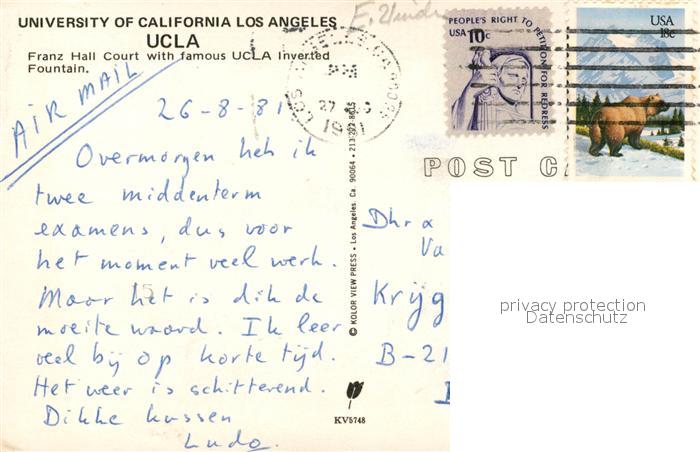 73131818 old postcard Los Angeles California UCLA University Franz Hall Court Fountain postalisch gelaufen Erhaltung siehe scans [FriedD77] KatCode: 14140050000000