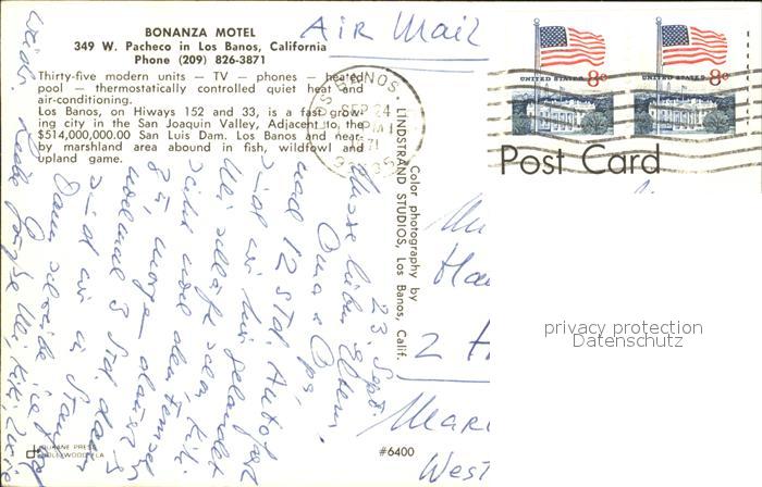 72290227 old postcard Los Banos Bonanza Motel postalisch gelaufen Erhaltung siehe scans KatCode: 14140050000000