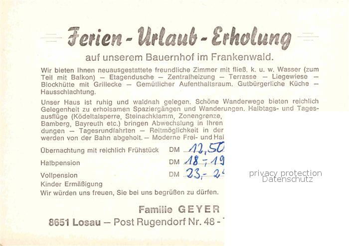 72678558 Losau Rugendorf Urlaub auf dem Bauernhof Geyer im Frankenwald postalisch nicht gelaufen Werbekarte (keine Postkarte) Erhaltung siehe scans [FriedD77] KatCode: 11110009477151