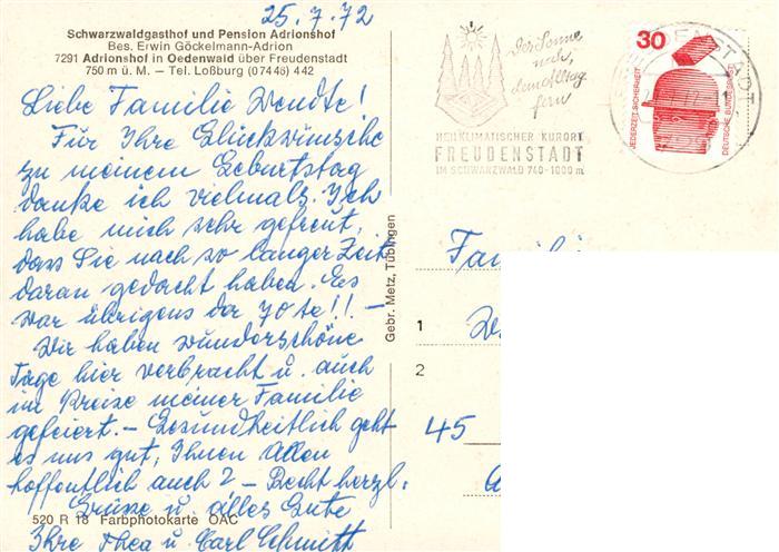 73925028 alte Postkarte Lossburg Schwarzwaldgasthof und Pension Adrionshof postalisch gelaufen Erhaltung siehe scans [WerneD78] KatCode: 11110008237045
