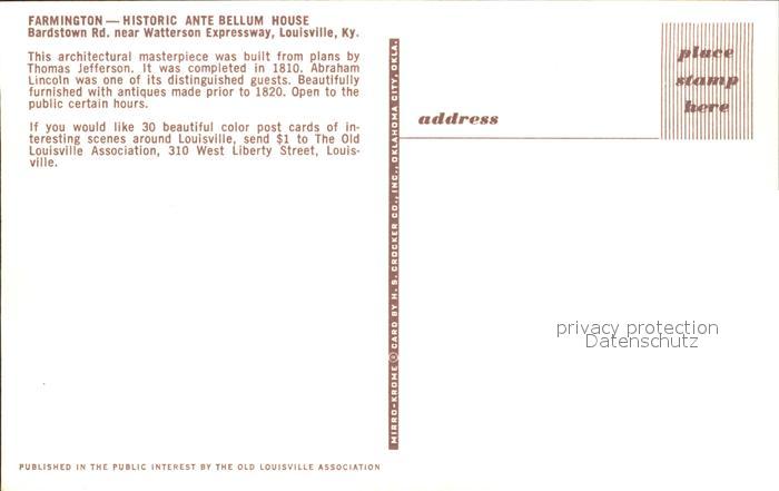 11688118 Louisville Kentucky Farmington Historic Ante Bellum House Thomas Jefferson 19th Century postalisch nicht gelaufen Erhaltung siehe scans KatCode: 14140190000000