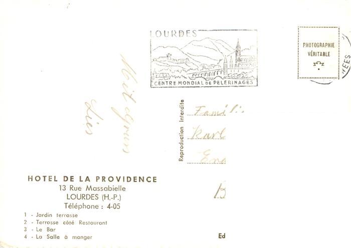 13889228 Lourdes 65 Jardin terrasse Terrasse cote Restaurant Le Bar La Salle a manger postalisch gelaufen Erhaltung siehe scans [WerneD78] carte postale Wern Katcode 11170065165286