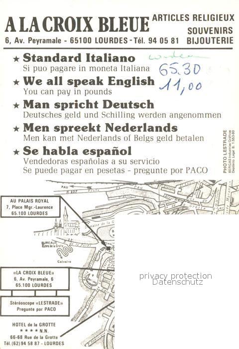 13244582 Lourdes Hautes Pyrenees A La Croix Bleue Grotte Hotels Shop postalisch nicht gelaufen Werbekarte (keine Postkarte) Erhaltung siehe scans [FriedD77] KatCode: 11170065165286