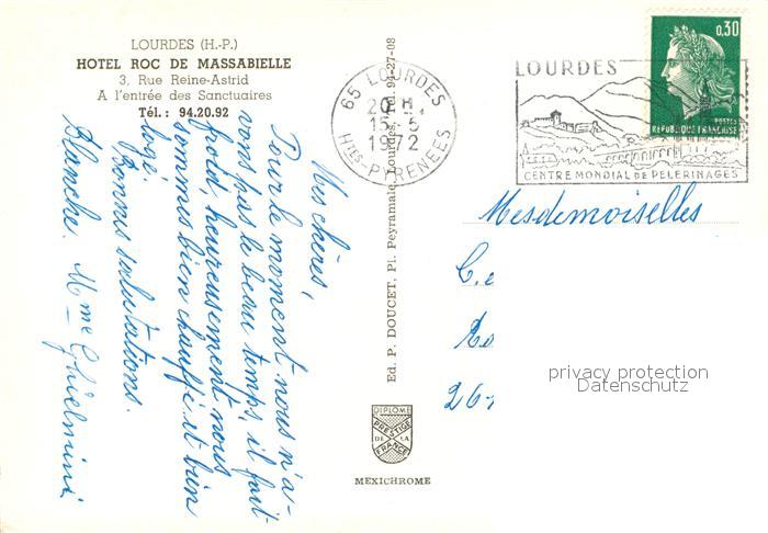 13234772 carte postale Lourdes Hautes Pyrenees Hotel Roc de Massabielle postalisch gelaufen Erhaltung siehe scans [FriedD77] KatCode: 11170065165286