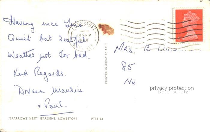 old postcard Lowestoft Suffolk Sparrows Nest Gardens postalisch gelaufen Erhaltung siehe scans
