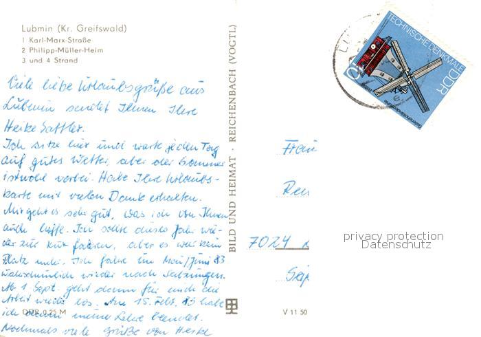 73099987 alte Postkarte Lubmin Ostseebad Karl Marx Strasse Philipp Mueller Heim Strand postalisch gelaufen Erhaltung siehe scans [KathaD81] KatCode: 11110013059055
