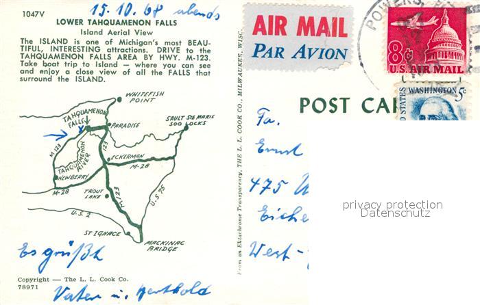 72925330 old postcard Luce County Lower Tahquamenon Falls Island aerial view postalisch gelaufen Erhaltung siehe scans [FriedD77] KatCode: 14140240000000