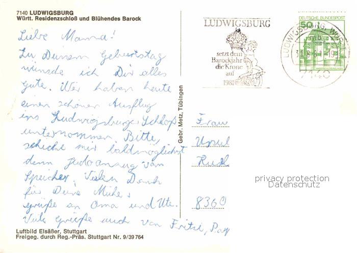 72892023 alte Postkarte Ludwigsburg Wuerttemberg Fliegeraufnahme Residenzschloss postalisch gelaufen Erhaltung siehe scans [AndreD76] KatCode: 11110008118048