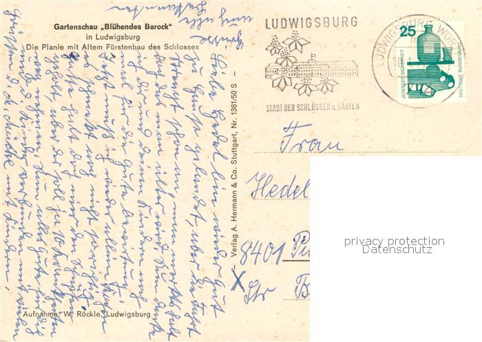 73746173 alte Postkarte Ludwigsburg Wuerttemberg Gartenschau Bluehendes Barock Die Planie mit Altem Fuerstenbau des Schlosses postalisch gelaufen Erhaltung siehe scans [WerneD78] KatCode: 11110008118048