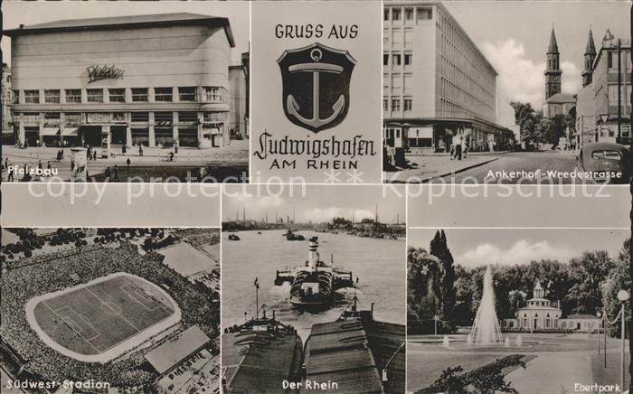 41753823 alte Postkarte Ludwigshafen Rhein Ankerhof-Wredestrasse Eberpark Rhei Stadion Pfalzbau postalisch gelaufen Erhaltung siehe scans KatCode: 11110007314000