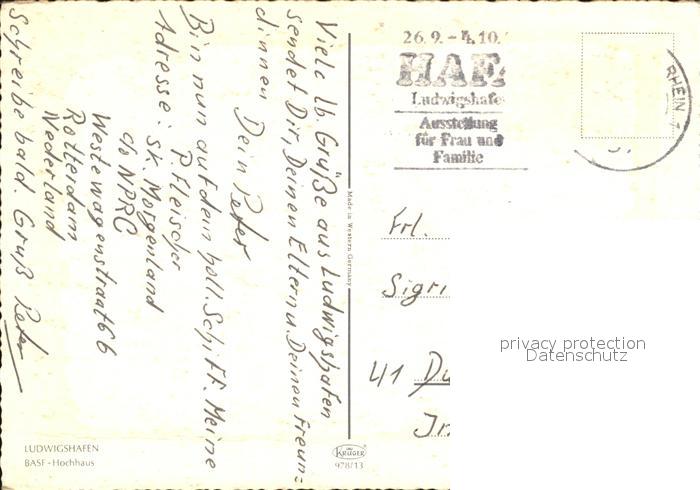 72528181 alte Postkarte Ludwigshafen Rhein BASF Hochhaus Seerosenteich postalisch gelaufen Erhaltung siehe scans KatCode: 11110007314000