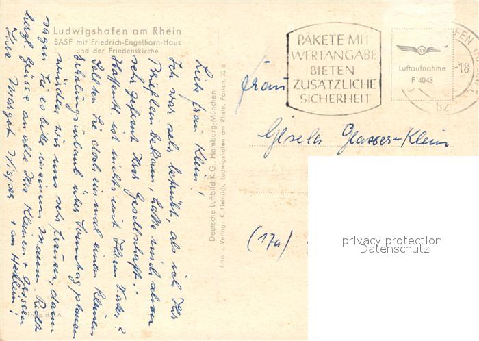 73198093 alte Postkarte Ludwigshafen Rhein Fliegeraufnahme BASF Friedrich Engelhorn Haus Friedensbruecke postalisch gelaufen Erhaltung siehe scans [KathaD81] KatCode: 11110007314000