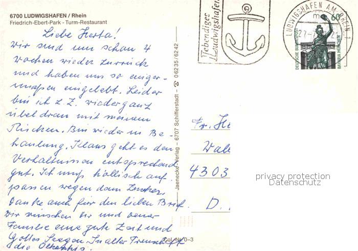 72696700 alte Postkarte Ludwigshafen Rhein Friedrich Ebert Park Turm Restaurant postalisch gelaufen Erhaltung siehe scans [FriedD77] KatCode: 11110007314000