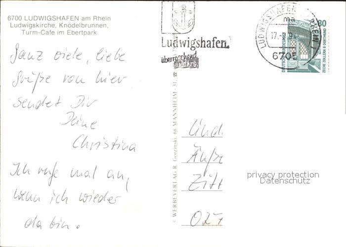 72533537 alte Postkarte Ludwigshafen Rhein Ludwigskirche Knoedelbrunnen Turmcafe im Ebertpark postalisch gelaufen Erhaltung siehe scans [WerneD78 kt116box] KatCode: 11110007314000