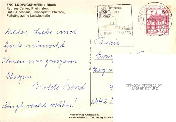 72770135 alte Postkarte Ludwigshafen Rhein Rathaus Center Rheinhafen BASF Hochhaus Berlinerplatz Fussgaengerzone postalisch gelaufen Erhaltung siehe scans [AndreD76] KatCode: 11110007314000