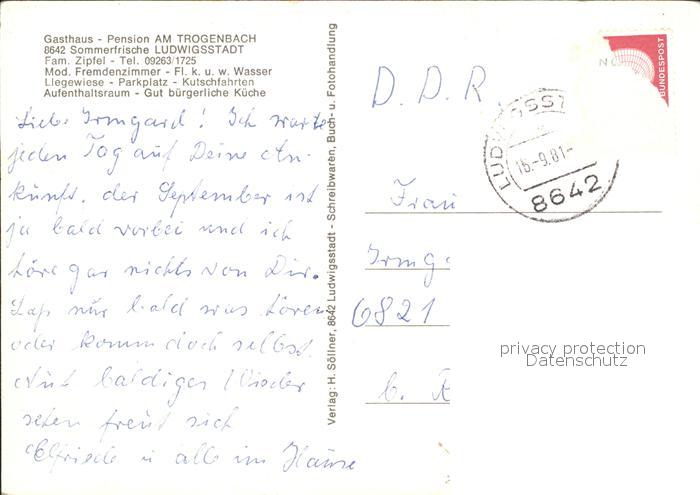 71847504 alte Postkarte Ludwigsstadt Gasthaus Pension Am Trogenbach postalisch gelaufen Erhaltung siehe scans KatCode: 11110009476152