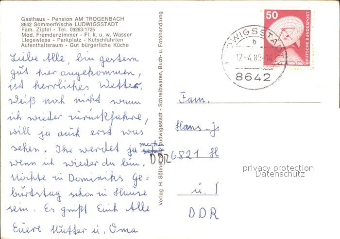 71847497 alte Postkarte Ludwigsstadt Gasthaus Pension Am Troggenbach postalisch gelaufen Erhaltung siehe scans KatCode: 11110009476152