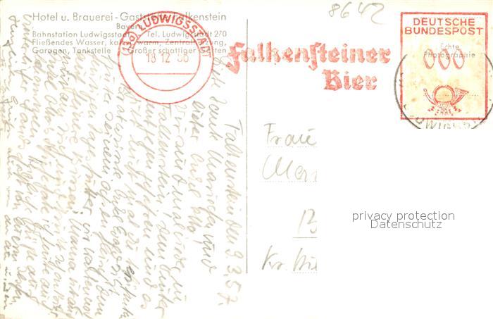 43361794 alte Postkarte Ludwigsstadt Hotel und Brauerei Gaststaette Falkenstein postalisch gelaufen Erhaltung siehe scans [WerneD78] KatCode: 11110009476152