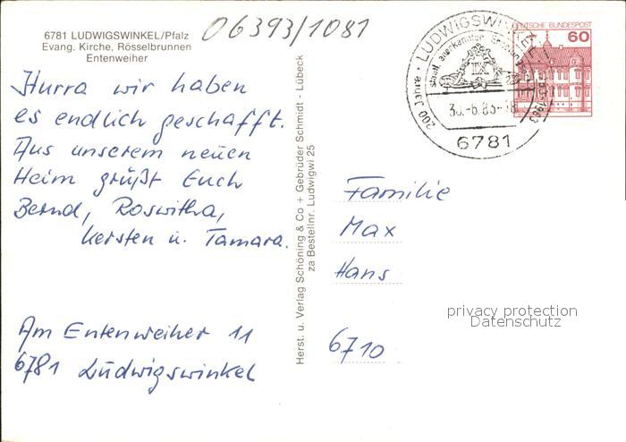 72032823 alte Postkarte Ludwigswinkel Evangelische Kirche Roesselbrunnen Entenweiher postalisch gelaufen Erhaltung siehe scans KatCode: 11110007340029