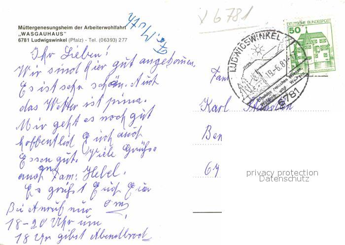 72761121 alte Postkarte Ludwigswinkel Wasgauhaus Muettergenesungsheim der Arbeiterwohlfahrt postalisch gelaufen Erhaltung siehe scans [LiesaD40] KatCode: 11110007340029