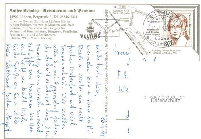 73648041 alte Postkarte Luebben Spreewald Kaffee Restaurant Schultze Pension Gartenterrasse Gaststube postalisch gelaufen Erhaltung siehe scans [WerneD78] KatCode: 11110012061316