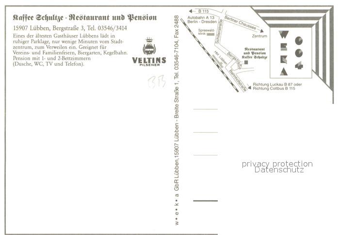 73648330 Luebben Spreewald Kaffee Schultze Restaurant Gartenterrasse Rezeption postalisch nicht gelaufen Erhaltung siehe scans [WerneD78] KatCode: 11110012061316