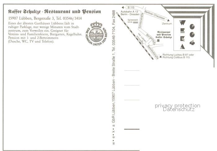 73572103 Luebben Spreewald Kaffee Schultze Restaurant und Pension postalisch nicht gelaufen Erhaltung siehe scans [FriedD77] KatCode: 11110012061316