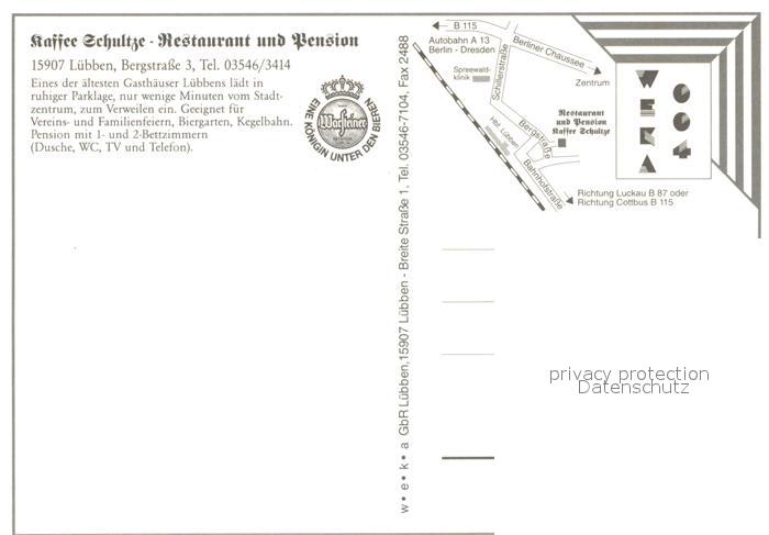 73572113 Luebben Spreewald Kaffee Schultze Restaurant und Pension postalisch nicht gelaufen Erhaltung siehe scans [FriedD77] KatCode: 11110012061316