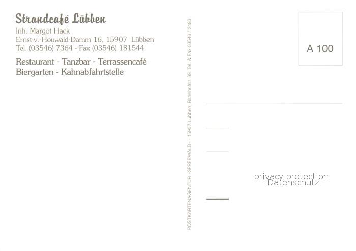 73858996 Luebben Spreewald Strandcafe Luebben Restaurant Terrassencafe Biergarten Kahnabfahrtstelle postalisch nicht gelaufen Erhaltung siehe scans [WerneD78] KatCode: 11110012061316