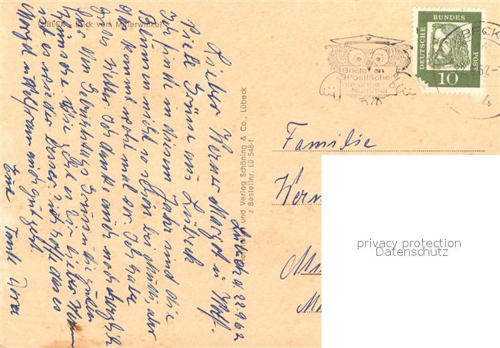73020070 alte Postkarte Luebeck Blick vom Malerwinkel mit Bruecke und Kirche postalisch gelaufen Erhaltung siehe scans [WerneD78] KatCode: 11110001003000