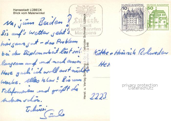73217275 alte Postkarte Luebeck Blick vom Malerwinkel Uferpromenade Trave Bruecke Kirche postalisch gelaufen Erhaltung siehe scans [FriedD77] KatCode: 11110001003000
