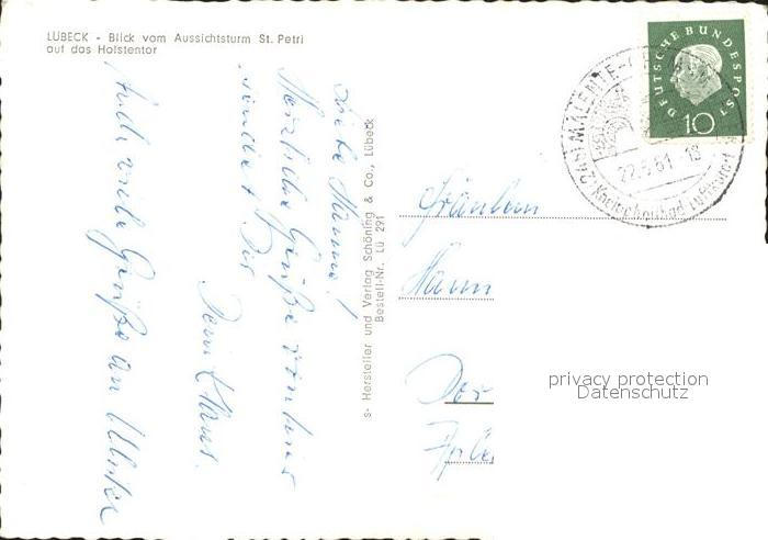 72316962 alte Postkarte LueBECK CITY Blick vom Aussichtsturm St Petri auf das Holstentor postalisch gelaufen Erhaltung siehe scans KatCode: 11110001003000