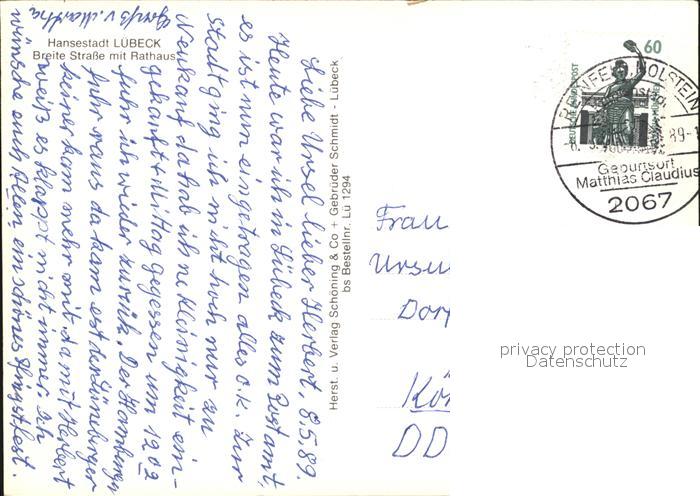 72613756 alte Postkarte LueBECK CITY Breite Strasse mit Rathaus postalisch gelaufen Erhaltung siehe scans [WerneD78] KatCode: 11110001003000