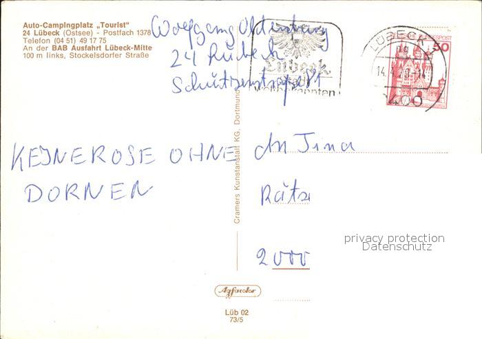 72539307 alte Postkarte LueBECK CITY Campingplatz Autoverladung Holstentor Waschraeume postalisch gelaufen Erhaltung siehe scans [AndreD76 kt119box] KatCode: 11110001003000